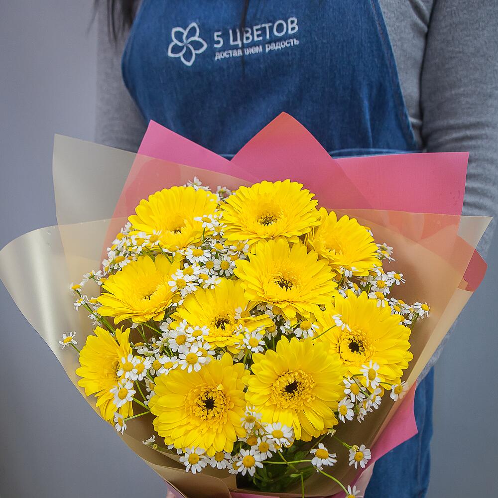Букет из 11 желтых гербер и 15 ромашек кустовых