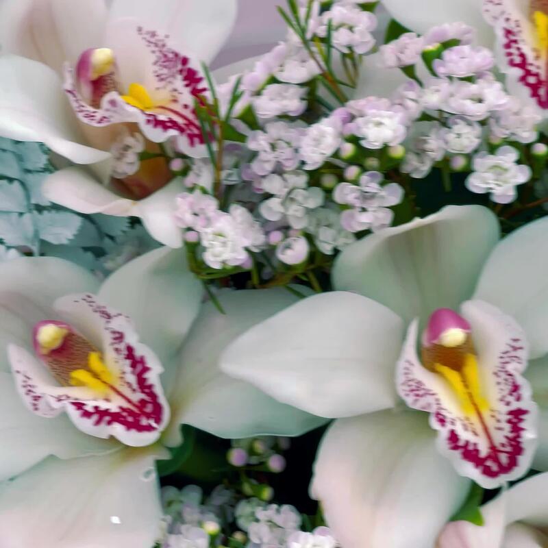 Орхидея Цимбидиум – 7 шт.Папоротник – 2 шт.Рускус – 10 шт.Лента атласная – 1 шт.Упаковка дизайнерская – 4 шт.гипсофила радужная – 2 шт.