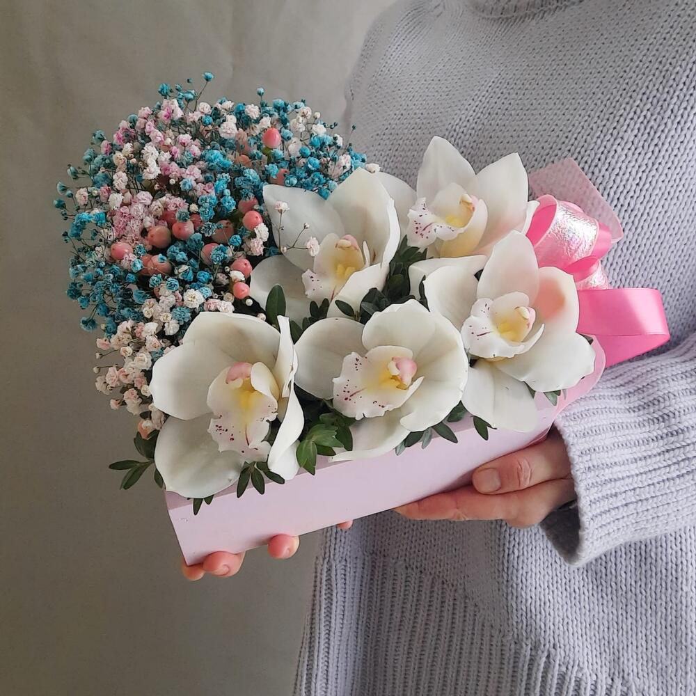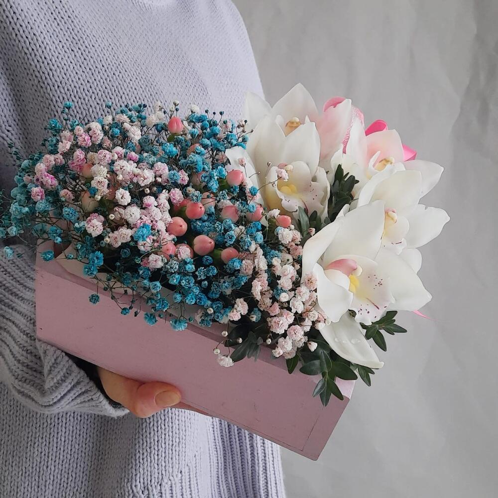 Орхидея Цимбидиум – 5 шт.Гипсофила – 2 шт.Гиперикум – 2 шт.Самшит – 1 шт.Оазис флористический – 1 шт.Сердце деревянное – 1 шт.Лента атласная – 2 шт.