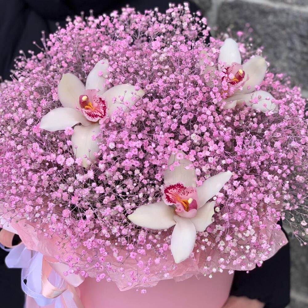 Гипсофила – 10 шт.Орхидея Цимбидиум – 3 шт.Коробка шляпная – 1 шт.Оазис флористический – 2 шт.Пленка матовая – 1 шт.Тишью – 3 шт.Лента атласная – 4 шт.