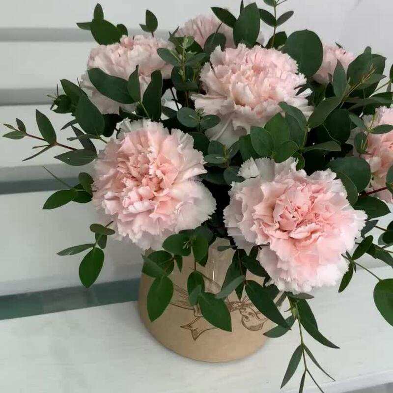 Эвкалипт – 2 шт.коробочка с оазисом – 1 шт.гвоздика кремовая диантус – 7 шт.