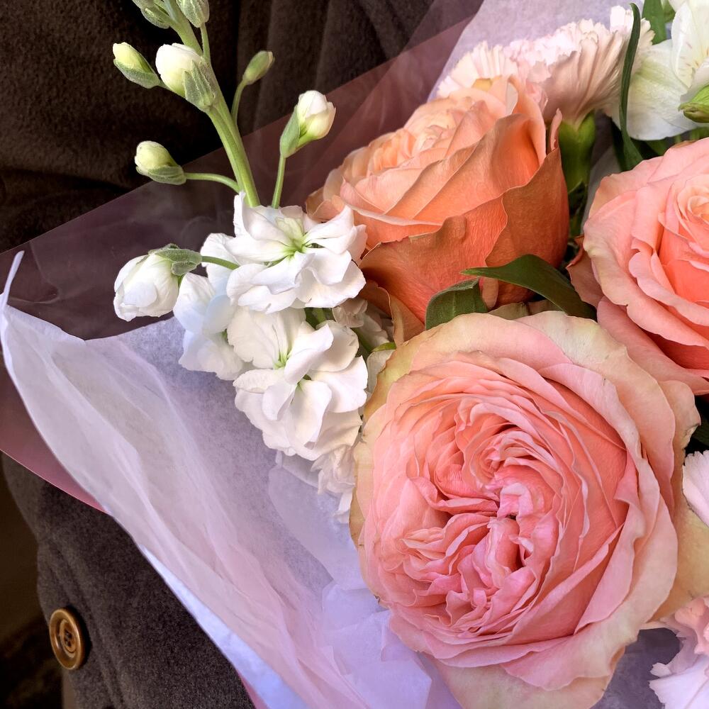 Авторский букет “Маленькая нежность”: пионовидная роза, нежная гвоздика и ароматная маттиола