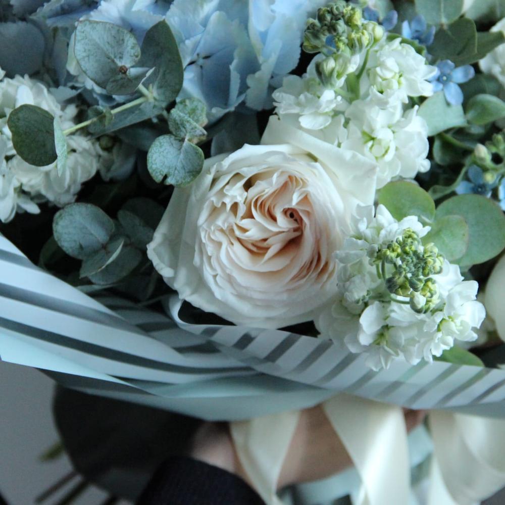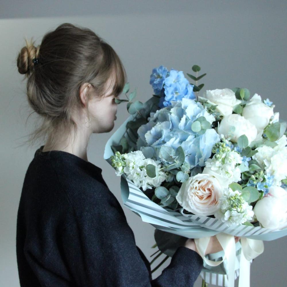 Дельфиниум – 2 шт.Твидия – 5 шт.Ранункулюс – 3 шт.Пион – 3 шт.Маттиола – 3 шт.Гвоздика – 5 шт.Упаковка дизайнерская – 2 шт.Лента атласная – 1 шт.