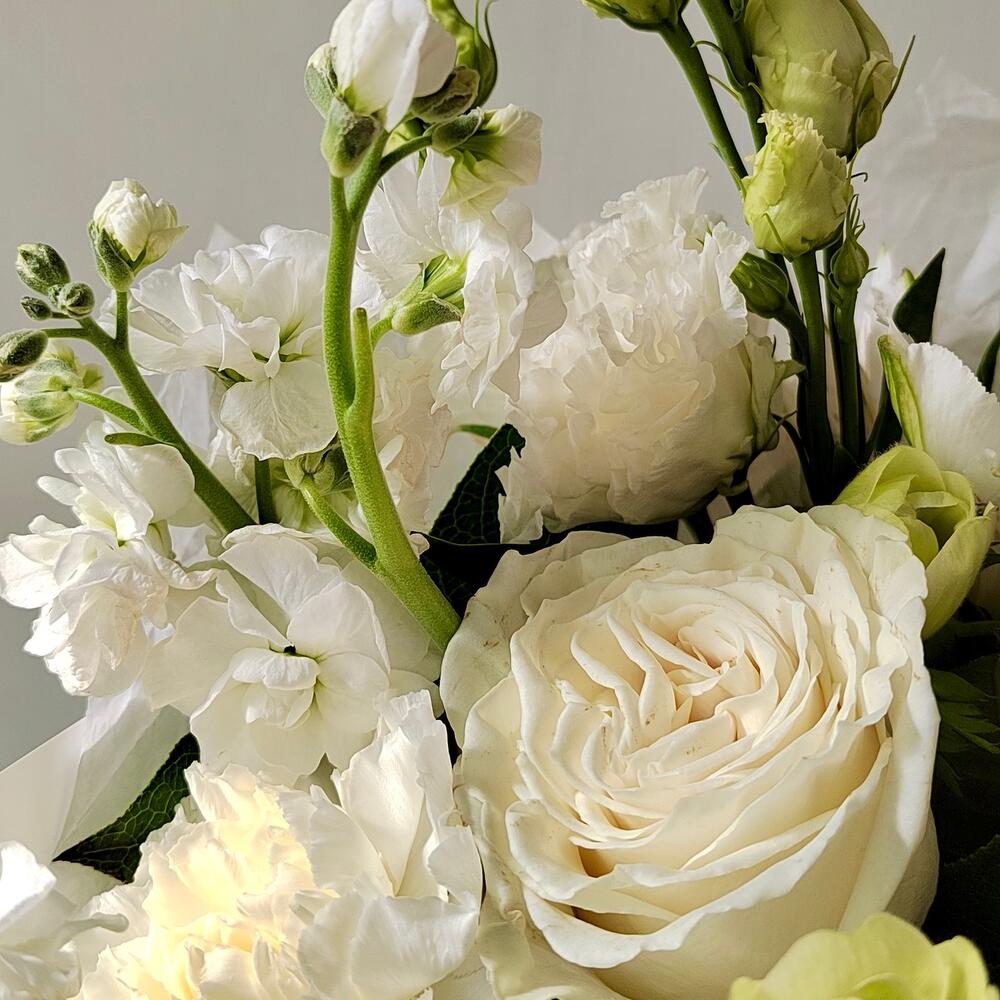 Альстромерия – 3 шт.Маттиола – 3 шт.Эустома – 2 шт.Лента атласная – 4 шт.Упаковка дизайнерская – 5 шт.Роза белая эквадор – 3 шт.гвоздика сортовая белая – 5 шт.зелень фисташка – 3 шт.