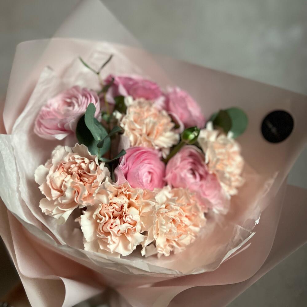 Ранункулюс – 5 шт.диантусы – 5 шт.Эвкалипт – 2 шт.декоративная упаковка – 1 шт.Атласная лента – 1 шт.