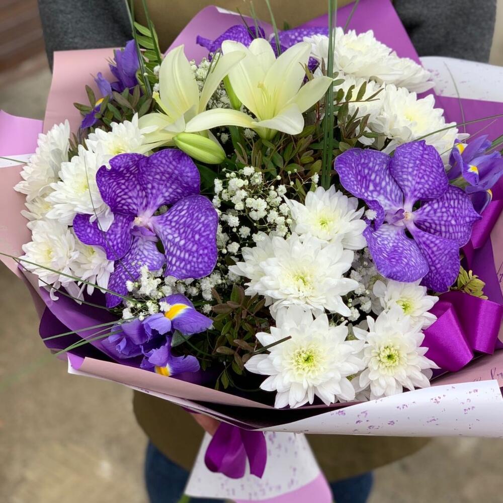 Ванда орхидея – 3 шт.Хризантема кустовая – 3 шт.Лилия Азиатская белая – 1 шт.Ирис – 3 шт.Зелень – 5 шт.Упаковка дизайнерская – 2 шт.Лента атласная – 1 шт.