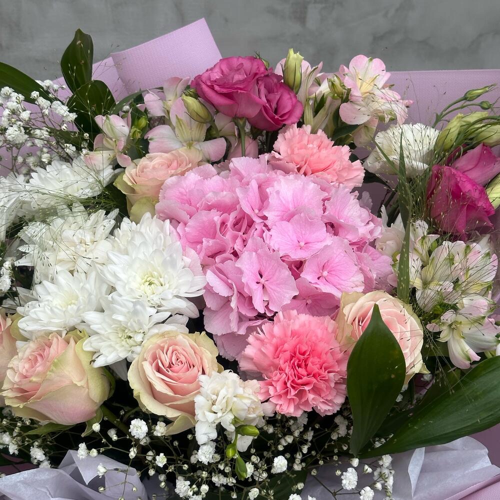 Альстромерии, Гортензии, Кустовые розы, Лизиантусы, Розы, Хризантемы