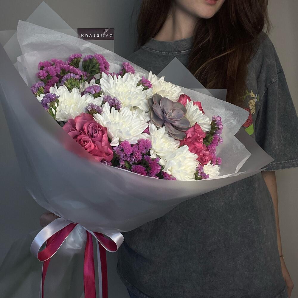 Статица – 4 шт. Хризантема кустовая – 3 шт. Суккулент – 1 шт. розы – 3 шт.