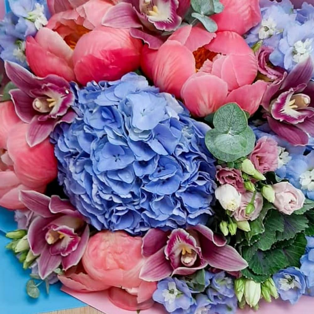 Гортензия – 1 шт.Эустома – 5 шт.Орхидея Цимбидиум – 5 шт.пион или ранункулюс – 5 шт.Дельфиниум – 5 шт.Эвкалипт – 2 шт.Упаковка – 3 шт.Лента атласная – 2 шт.