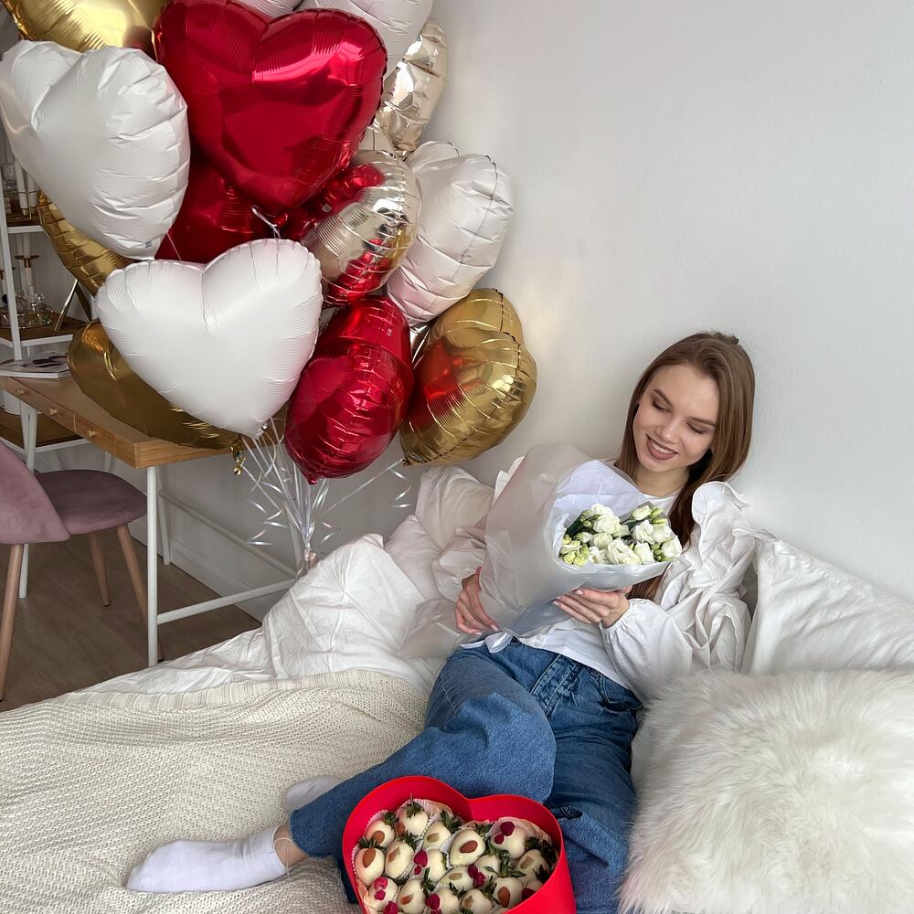 Состав:— Большая связка фольгированных шаров сердец – 20шт.— Букет из 5 веточек белой эустомы— Клубничный набор “Сердце”, большоеВ состав набора входит:- 7 ягод в белом бельгийском шоколаде Callebaut, декор: миндаль цельный- 8 ягод в белом бельгийском шоколаде Callebaut, декор: цельная сублимированная малина- 7 ягод в белом бельгийском шоколаде Callebaut, декор: золотой кандуринПримечание:— Клубничный набор имеет прозрачную крышку и перевязан атласной лентой с бантом.— Размеры упаковки 21*22 см.— Натуральный продукт. Срок годности клубники в шоколаде до 24 часов. Храните ягоду в холодильнике при температуре +4..+8 градусов.