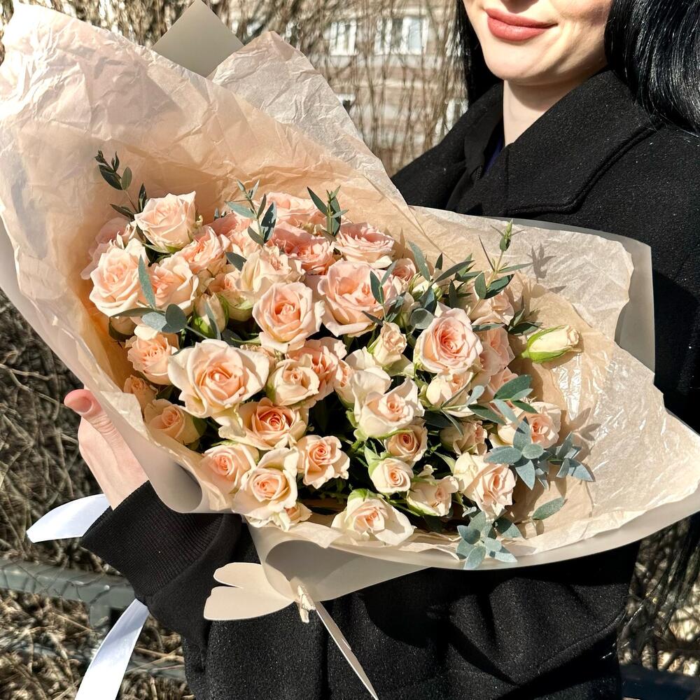 Роза кустовая – 11 шт.Эвкалипт – 3 шт.Лента атласная – 1 шт.Пленка матовая – 2 шт.Открыточка с вашими пожеланиями – 1 шт.тишью персиковое – 2 шт.