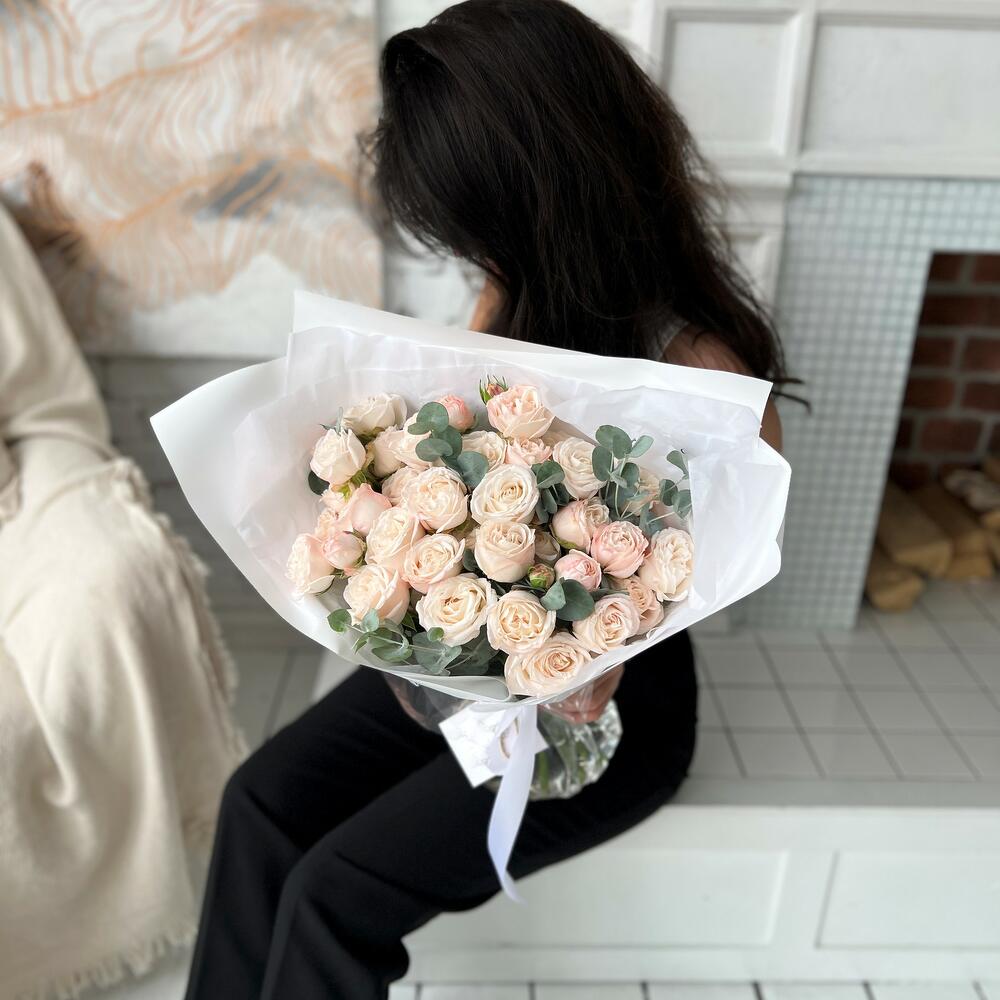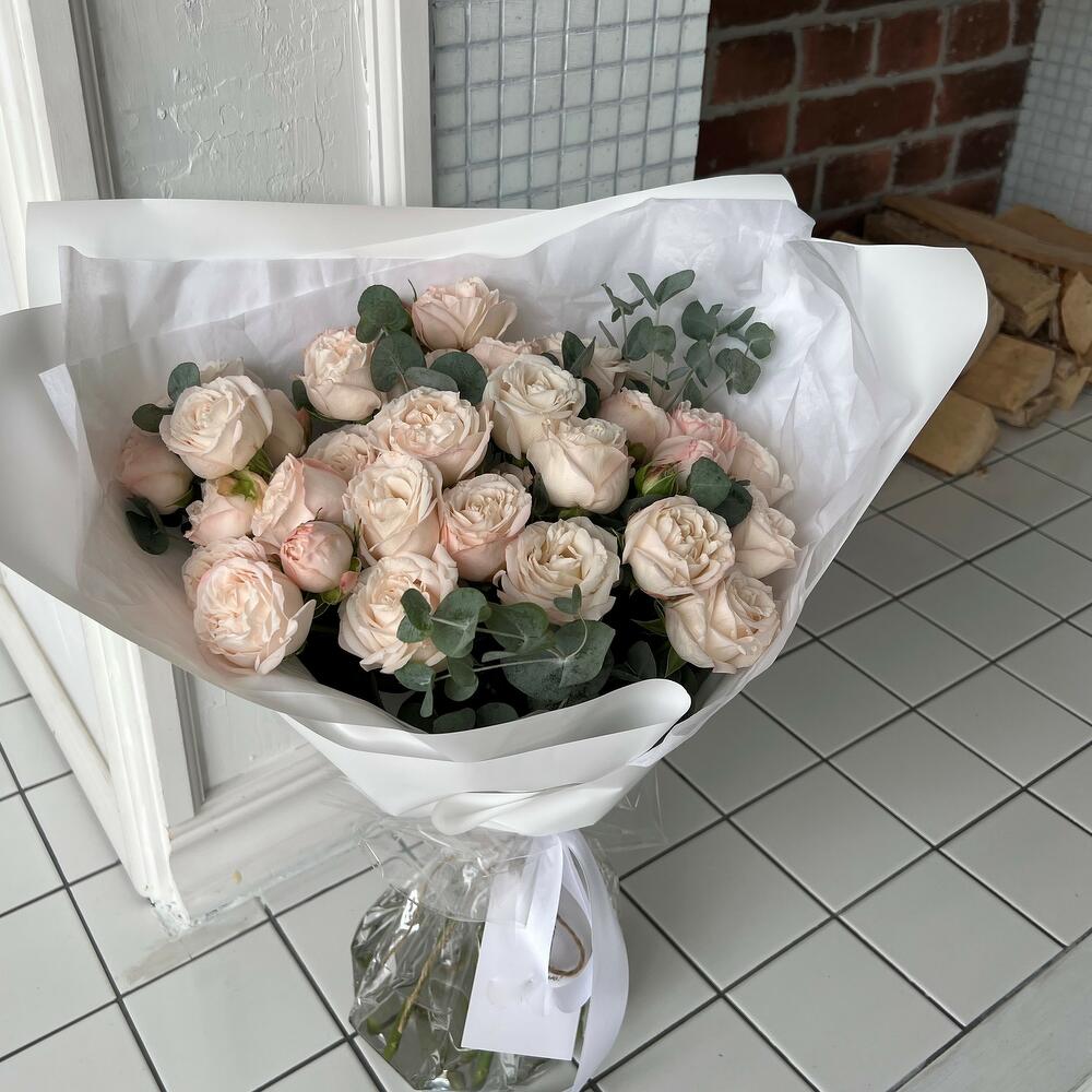 Кустовая пионовидная роза Бомбастик – 9 шт.Эвкалипт – 4 шт.