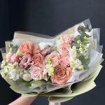 Гиперикум – 1 шт.Лизиантус – 1 шт.Маттиола – 2 шт.Тюльпан – 2 шт.Эвкалипт – 1 шт.Кустовая роза – 2 шт.Сантини – 1 шт.Пионовидная роза – 2 шт.Атласная лента – 1 шт.Одноголовая роза – 5 шт.декоративная упаковка – 1 шт.