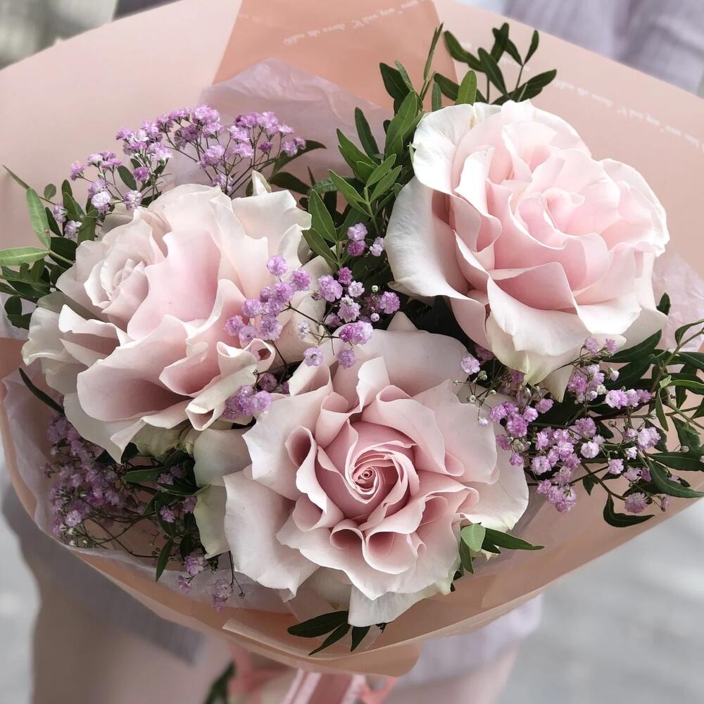 Гипсофила – 1 шт. Зелень – 1 шт. Упаковка дизайнерская – 1 шт. Французская роза – 3 шт.