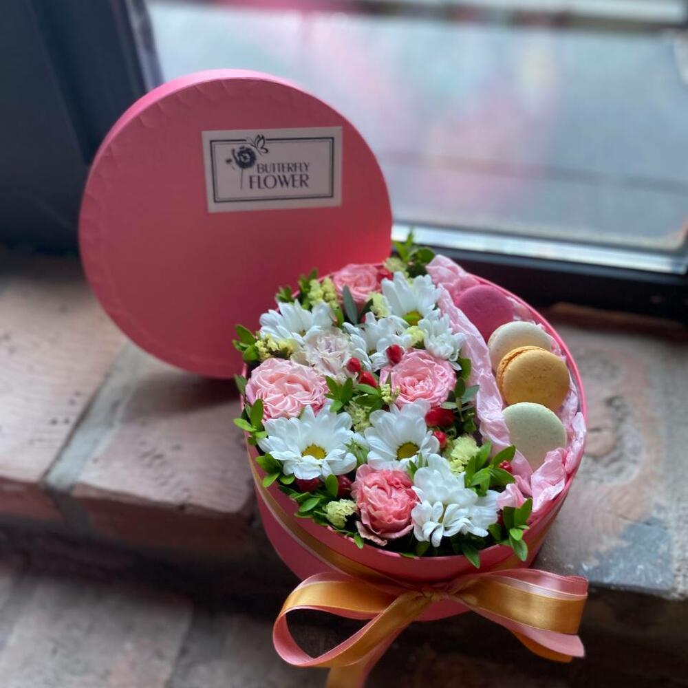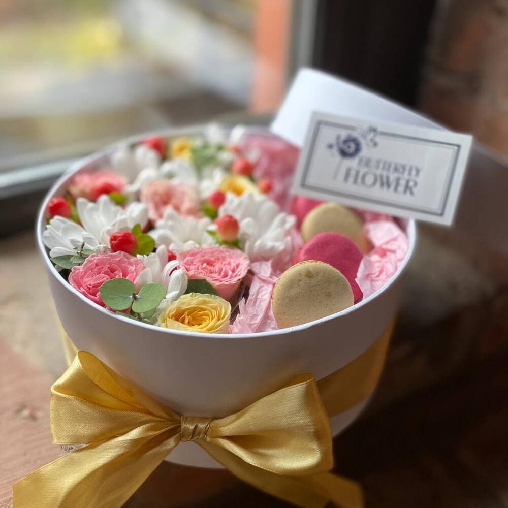 Букет из цветов и макаронс в декоративной коробке “Карамель”