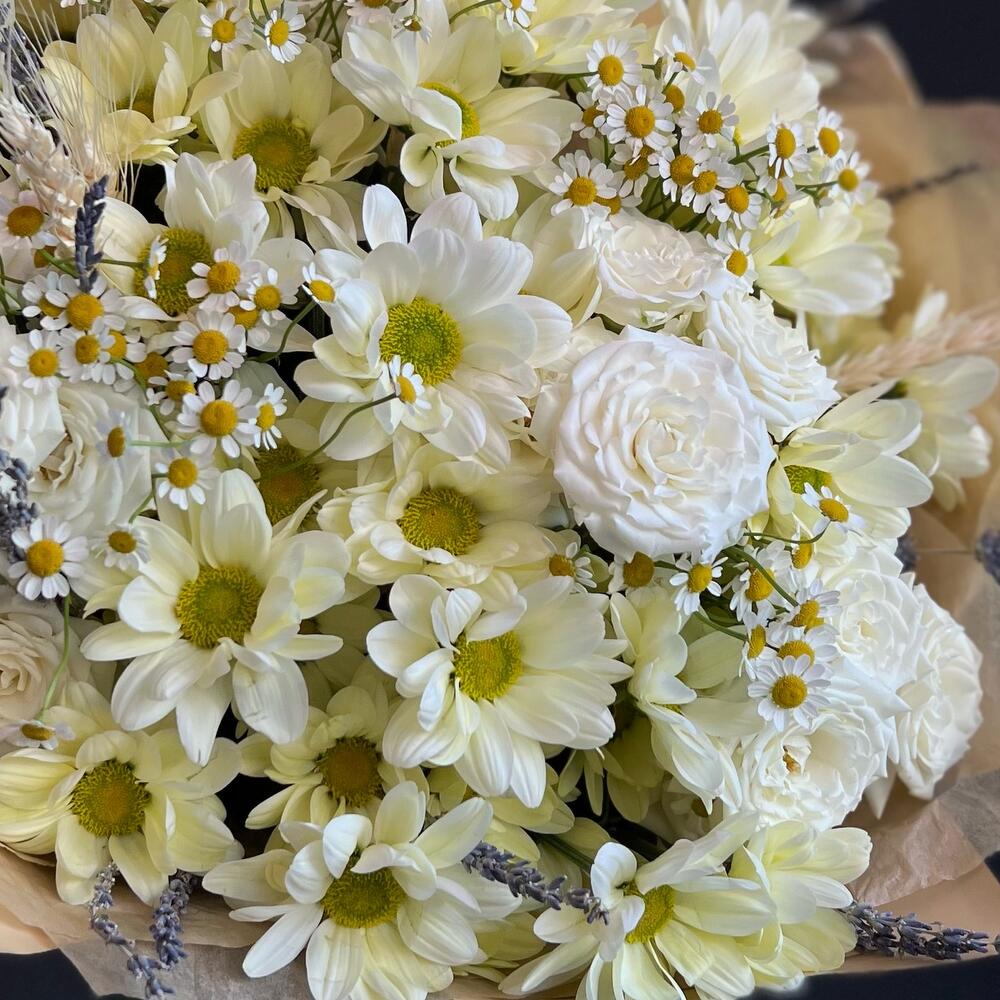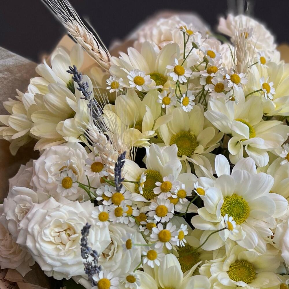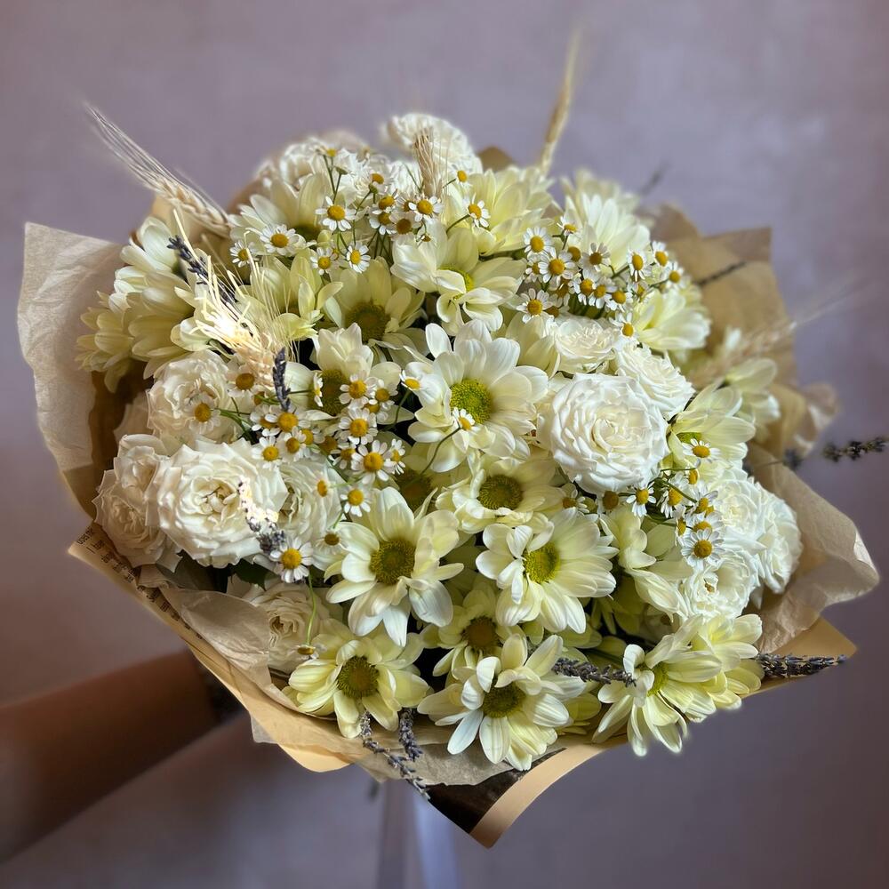 Кустовая хризантема – 5 шт.Ромашка – 5 шт.Кустовая роза – 3 шт.Колосья – 5 шт.Лаванда (сухоцвет) – 7 шт.декоративная упаковка – 1 шт.Атласная лента – 1 шт.