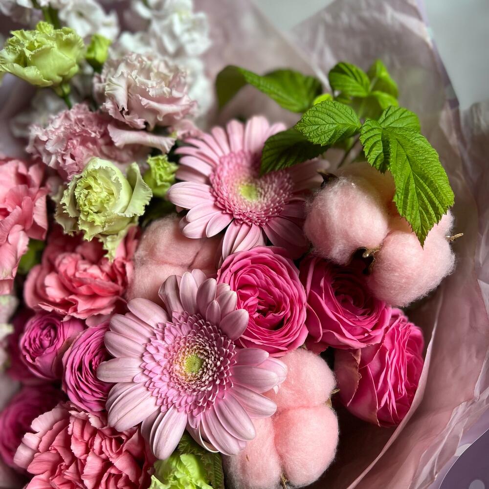 Кустовая роза – 3 шт.Маттиола – 2 шт.Гербера – 2 шт.Лизиантус – 2 шт.Гвоздика – 3 шт.Хлопок – 3 шт.декоративная упаковка – 1 шт.Атласная лента – 1 шт.