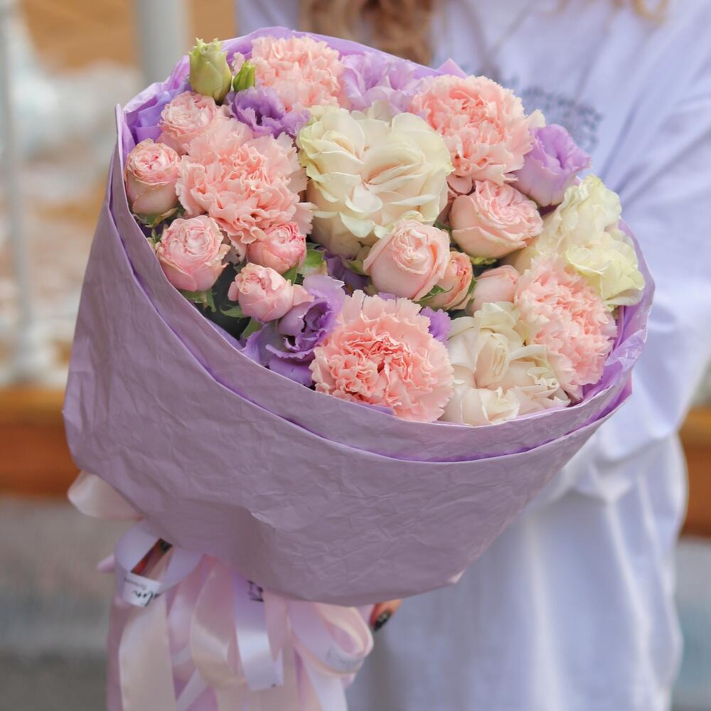 Роза пионовидная – 3 шт.Роза кустовая – 2 шт.Лизиантус – 2 шт.Гвоздика – 5 шт.Упаковка крафт – 1 шт.Открыточка с вашими пожеланиями – 1 шт.Шоколадка – 1 шт.