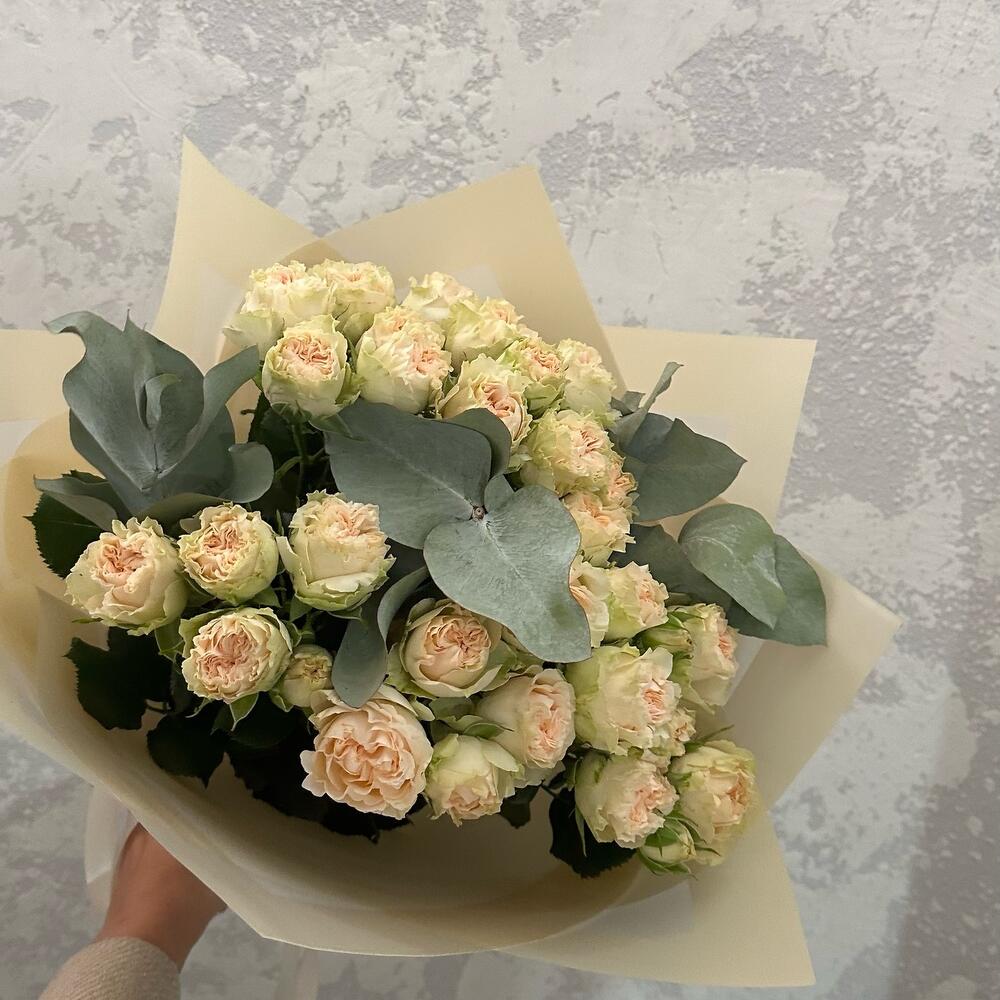 Эвкалипт – 1 шт. Кустовая пионовидная роза – 7 шт. Авторская упаковка – 1 шт.