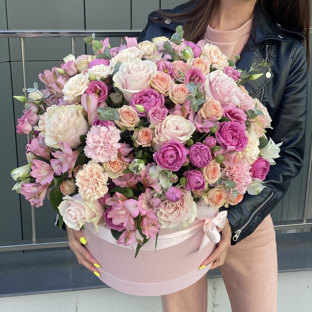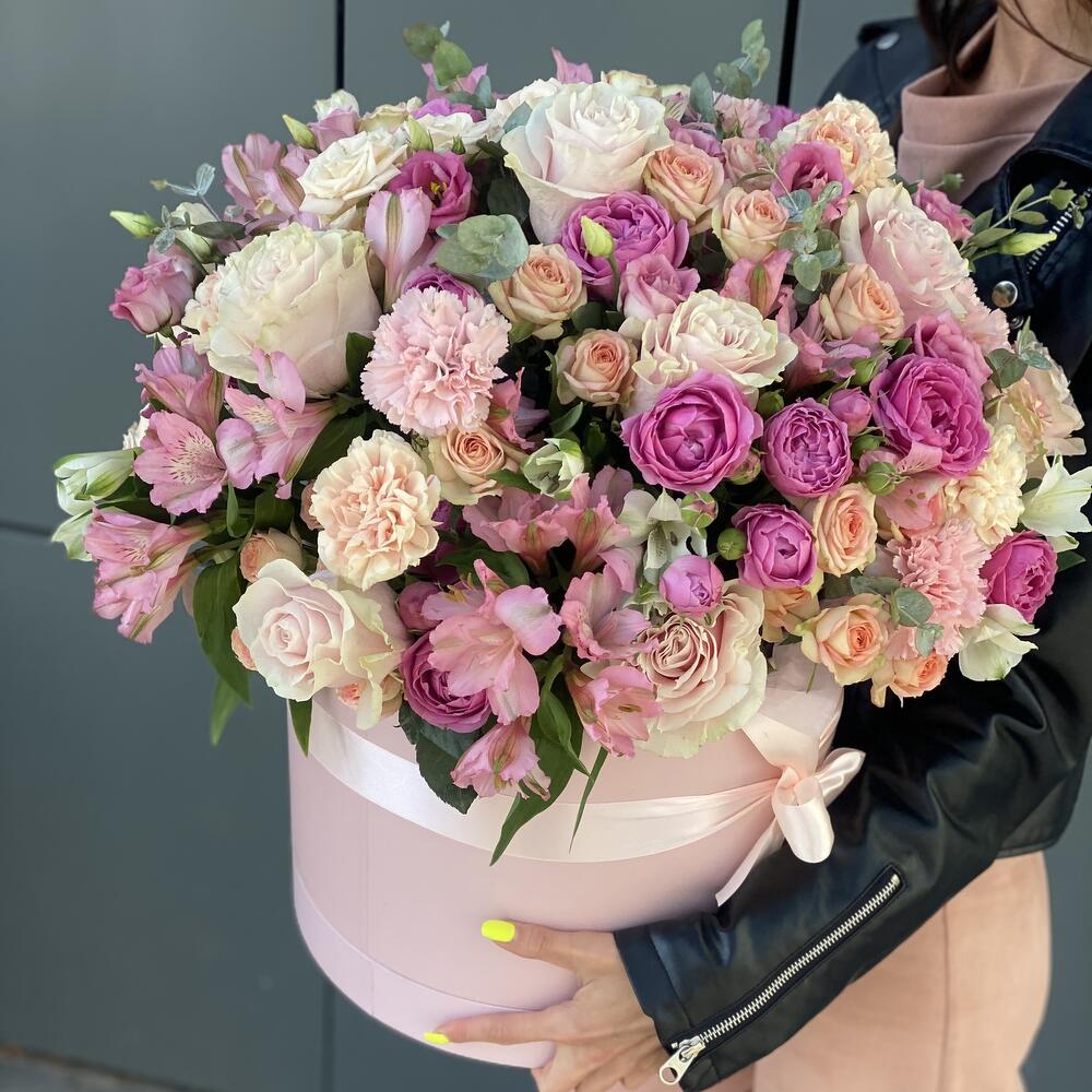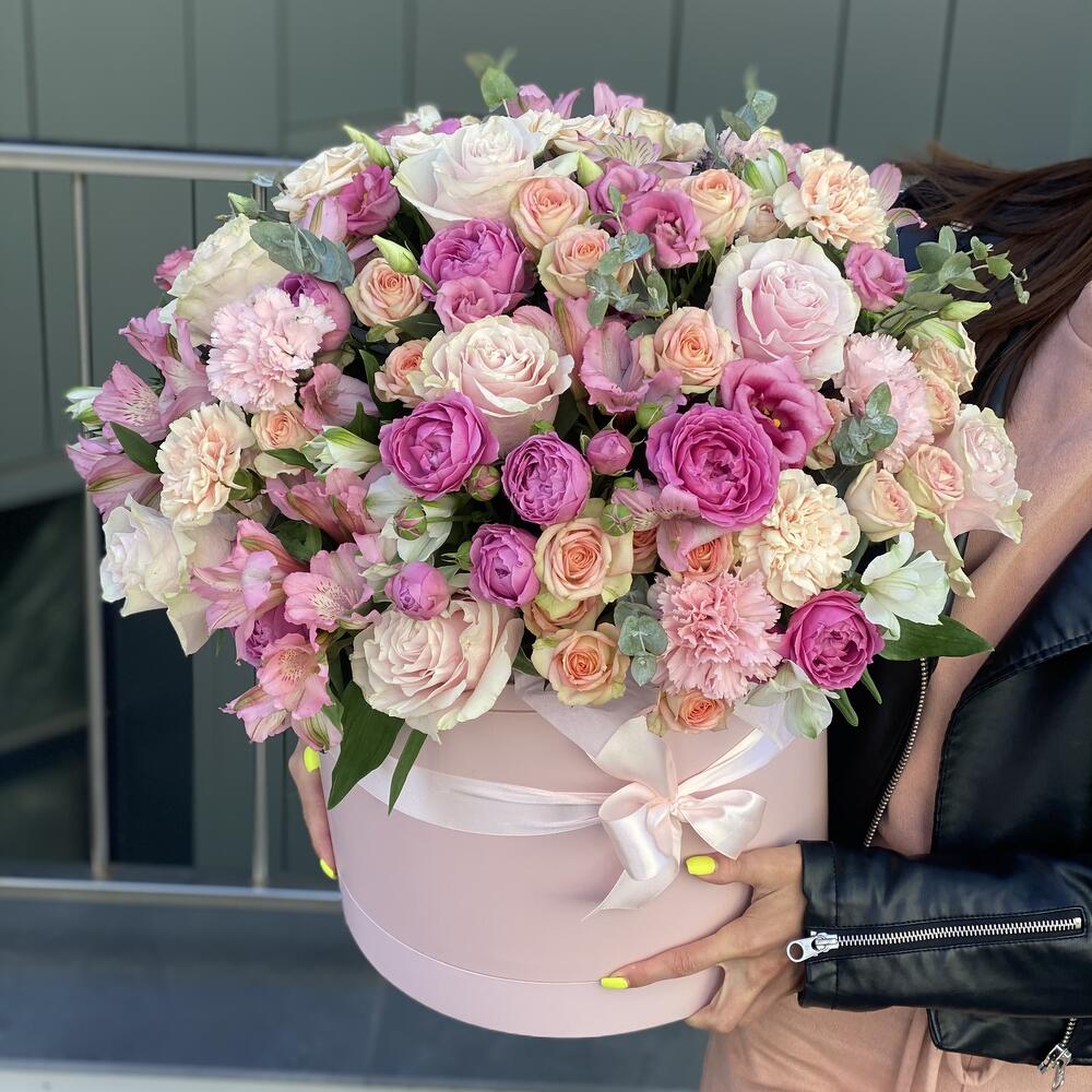 Коробка – 1 шт. Оазис – 4 шт. Эустома – 6 шт. Роза розовая – 10 шт. Эвкалипт – 4 шт. Кустовая роза – 18 шт. Гвоздика сортовая – 10 шт. Альстромерия – 13 шт. Оформление – 1 шт.