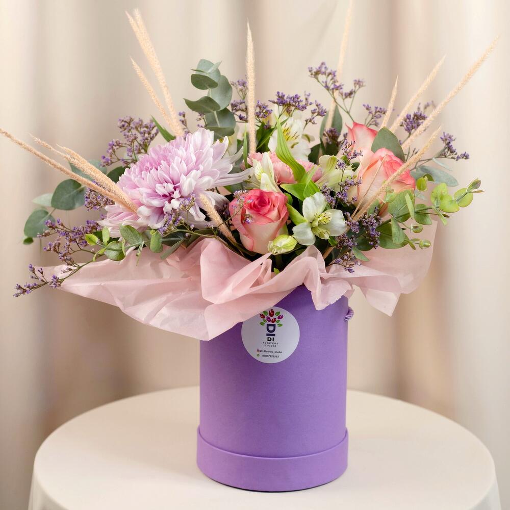 Хризантема – 1 шт. Роза – 3 шт. Альстромерия – 2 шт. Гвоздика – 2 шт. Флум – 1 шт. Лимониум – 1 шт. Эвкалипт – 1 шт.