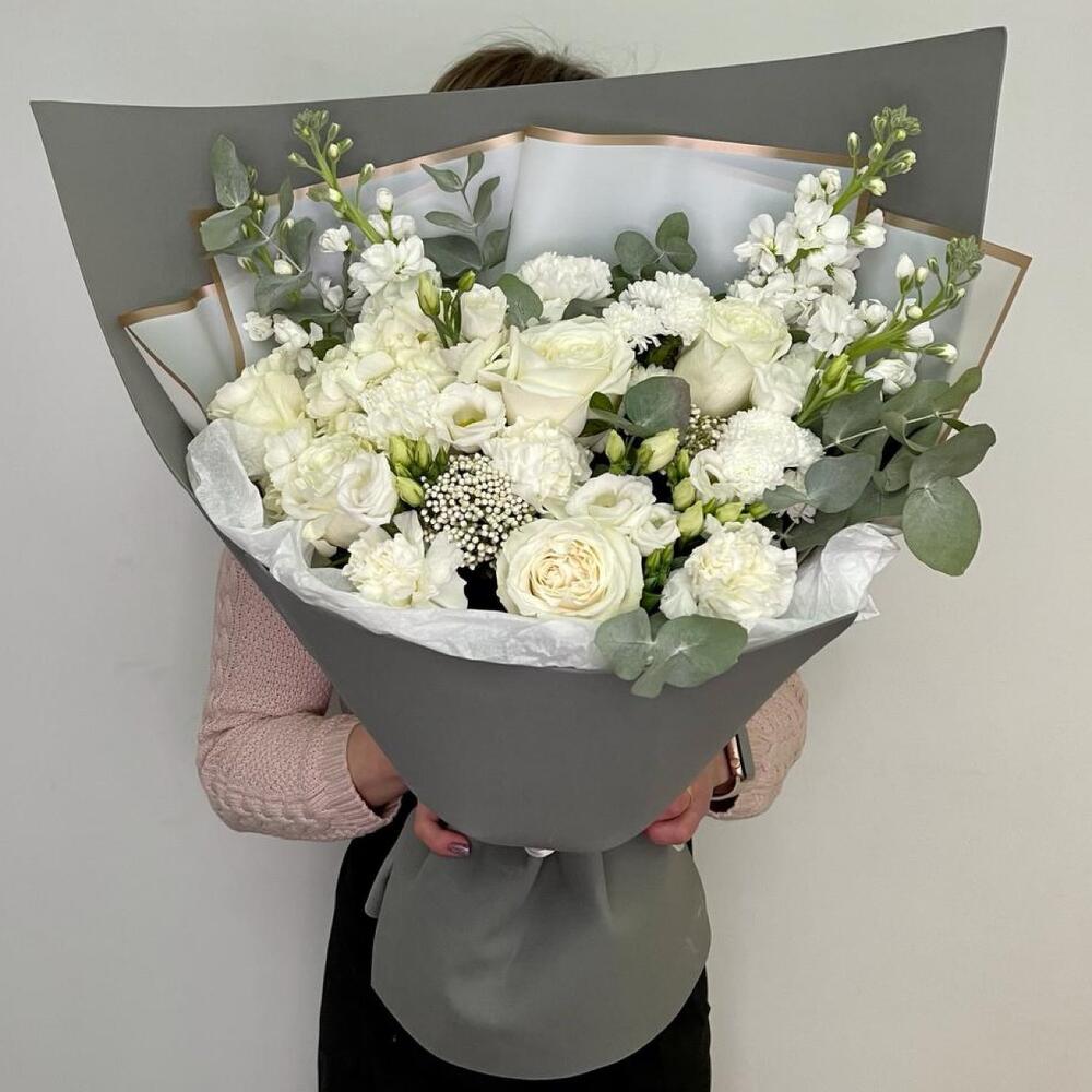 Гортензия – 1 шт.Роза Эквадор – 5 шт.Лизиантус – 2 шт.Маттиола – 4 шт.Озотамнус – 2 шт.Диантус – 5 шт.Сантини – 2 шт.Эвкалипт – 2 шт.Упаковка дизайнерская – 4 шт.